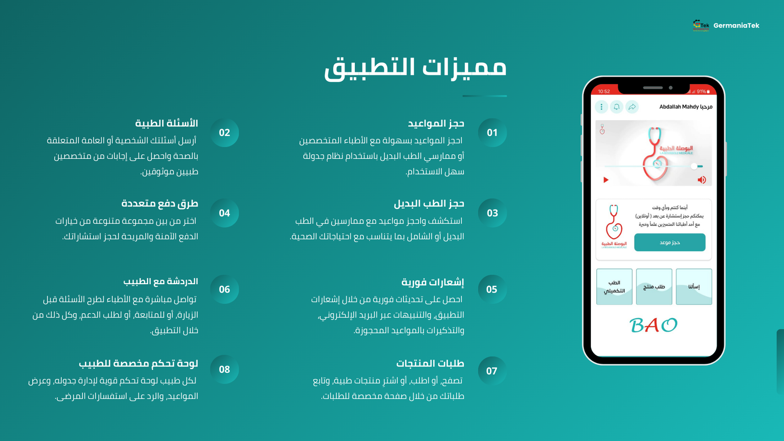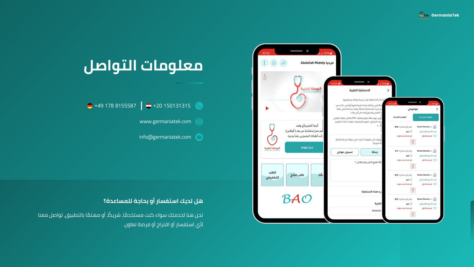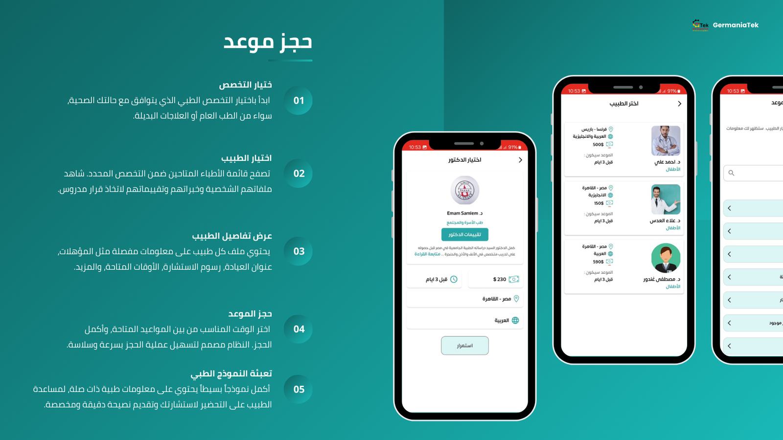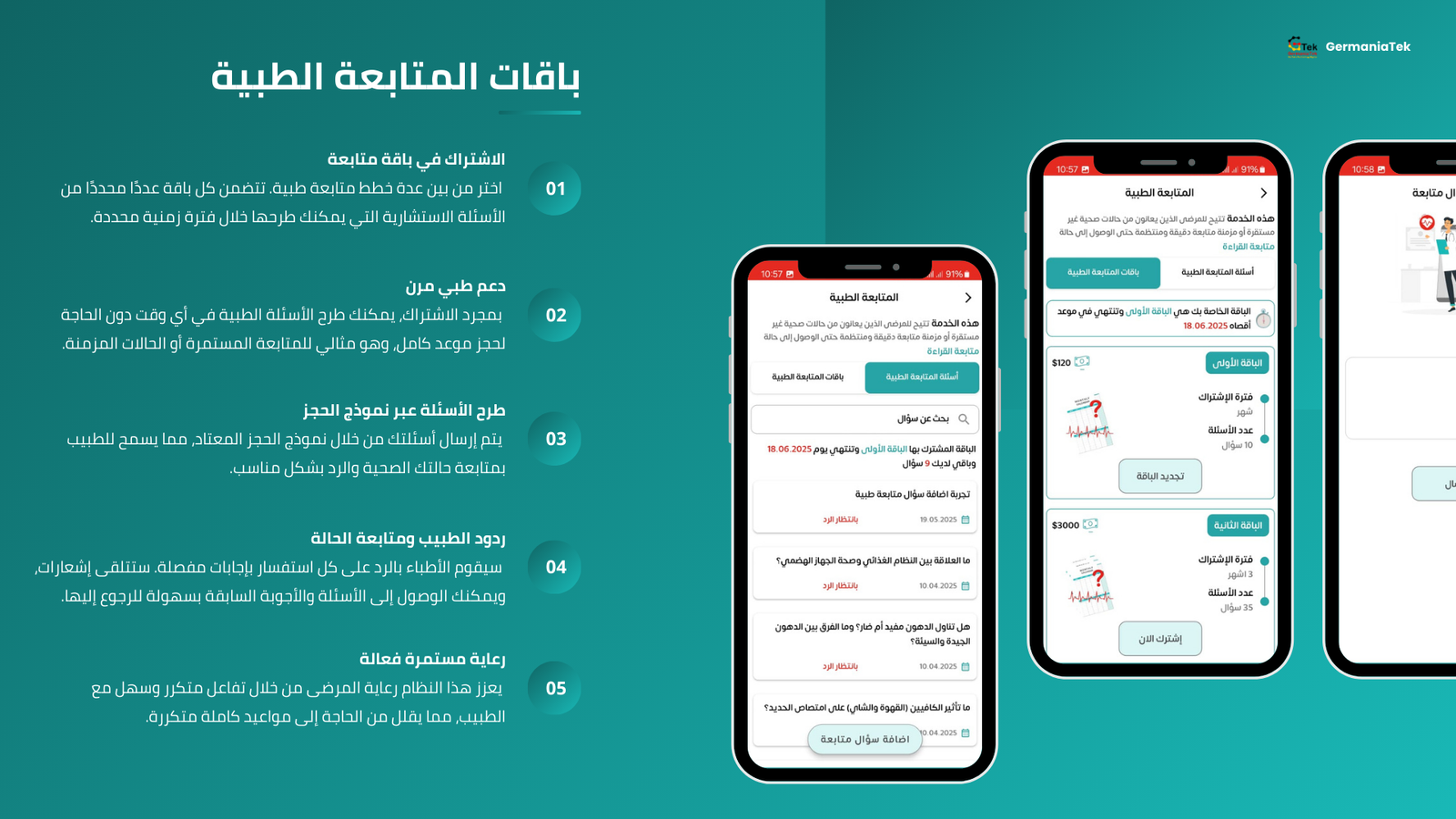 يشمل تطبيق موبايل، موقع إلكتروني، ولوحة تحكم للطبيب والمريض.