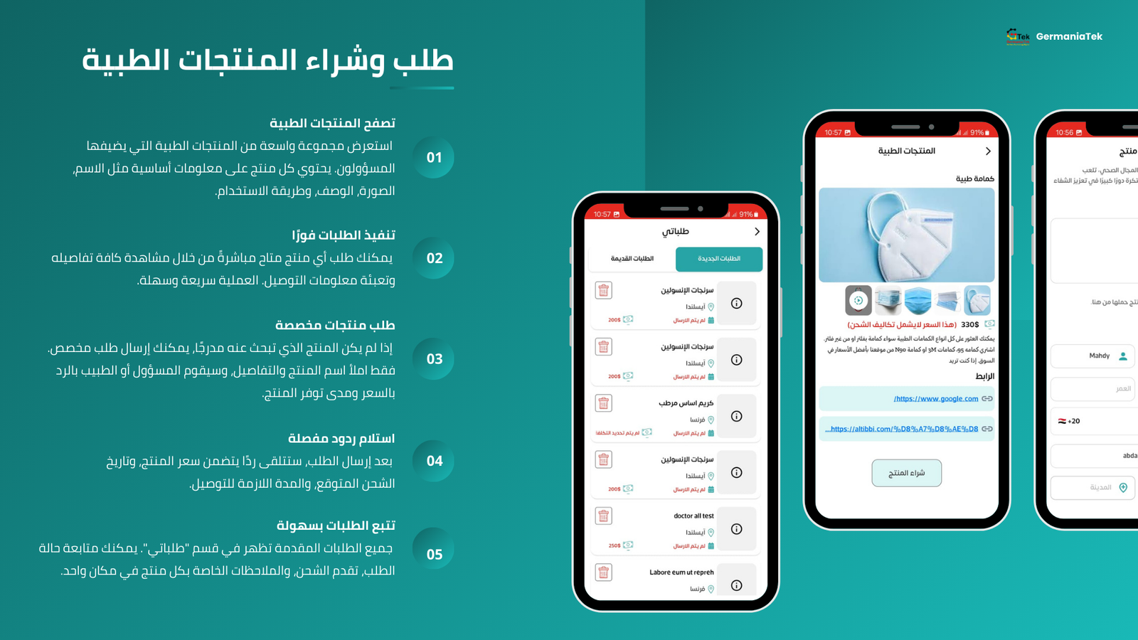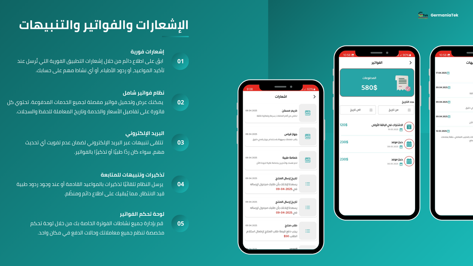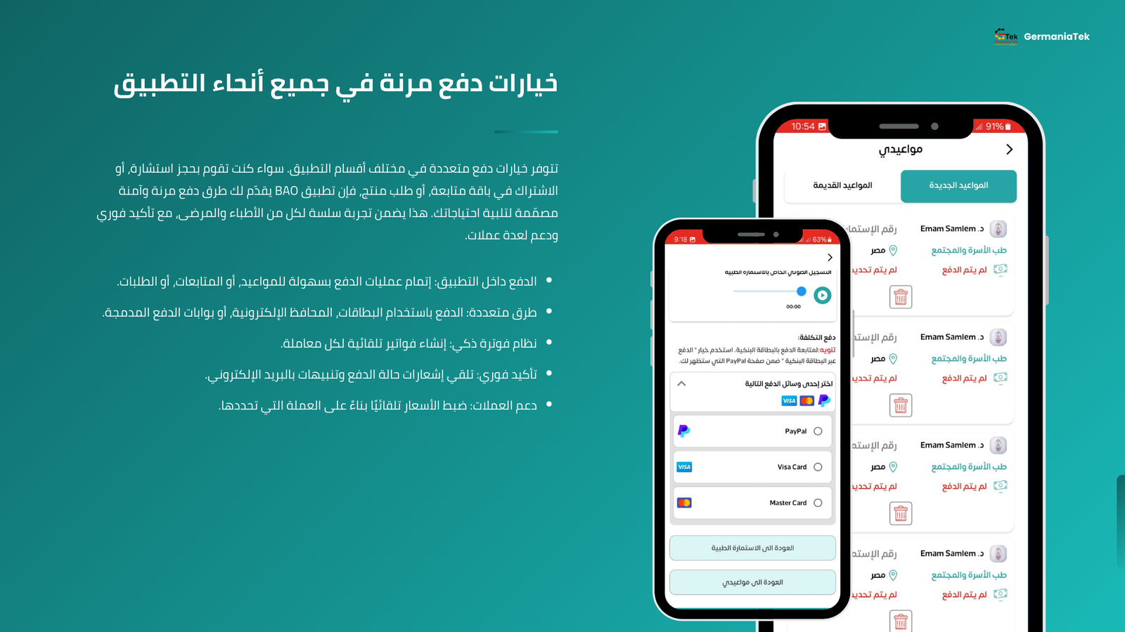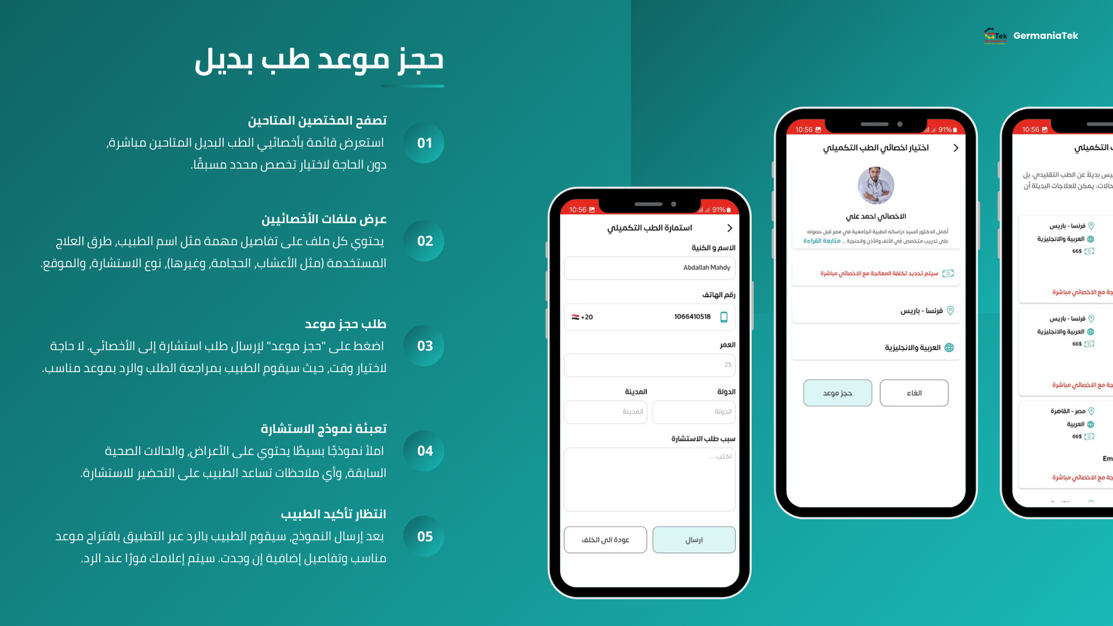 يشمل تطبيق موبايل، موقع إلكتروني، ولوحة تحكم للطبيب والمريض.